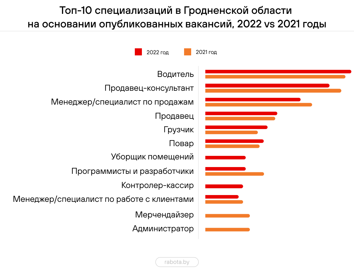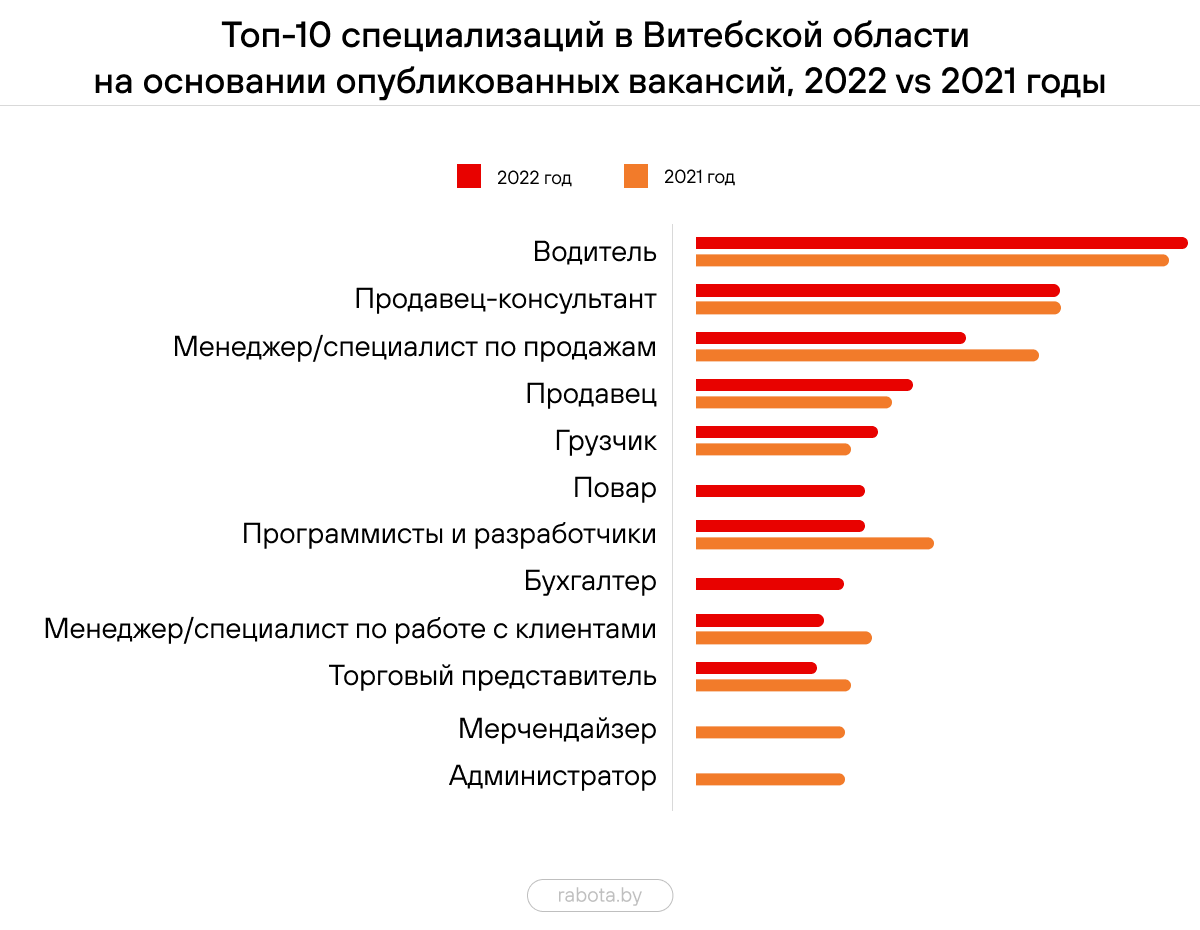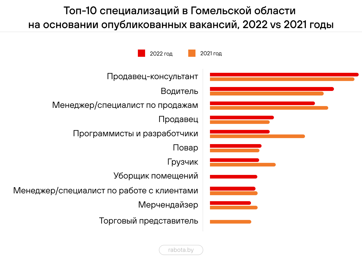 Гомеле и Гомельской области с 1-го на 2-е место ушли водители – их сменили продавцы-консультанты. Примечательно, что, как и в некоторых других регионах, торговые представители выбыли из топ-10 специализаций на основании опубликованных вакансий в 2022 году.