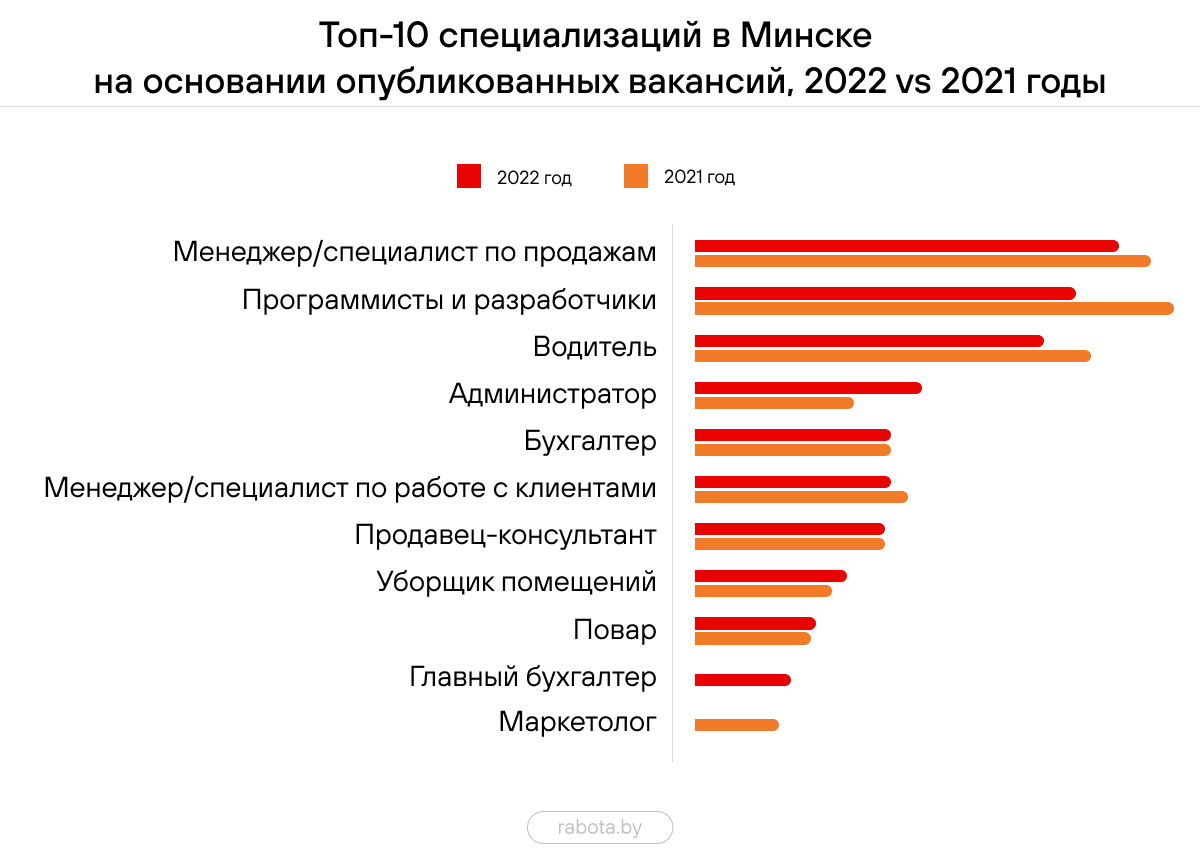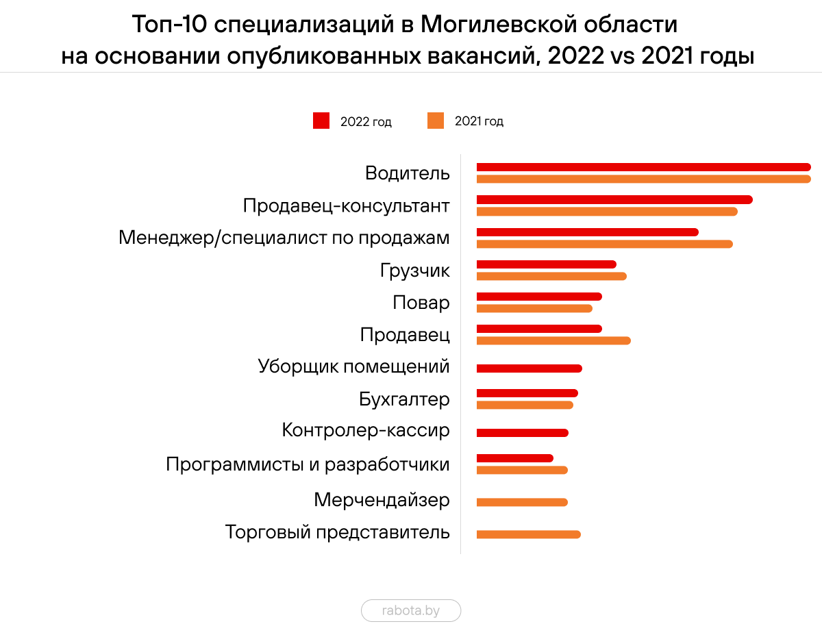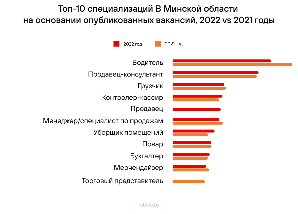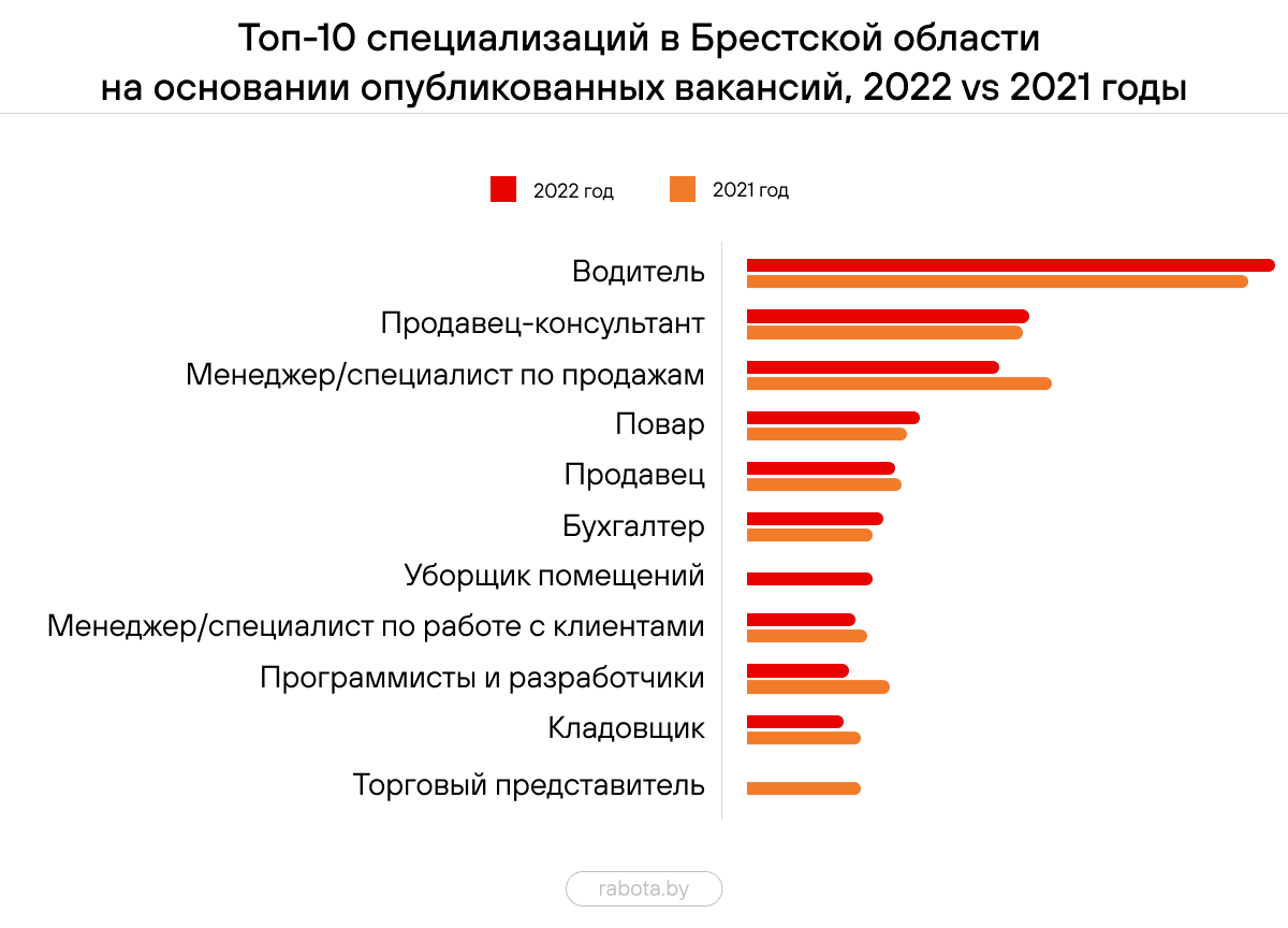 Гомеле и Гомельской области с 1-го на 2-е место ушли водители – их сменили продавцы-консультанты. Примечательно, что, как и в некоторых других регионах, торговые представители выбыли из топ-10 специализаций на основании опубликованных вакансий в 2022 году.