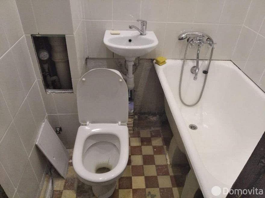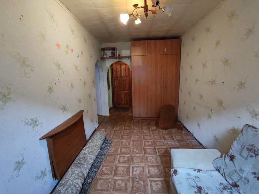 Здесь 31 квадратный метр, есть балкон и окна на две стороны комнаты. На полу линолеум, на стенах старые, но вполне опрятные обои. Ванна покрашена, а на полу постелена плитка.