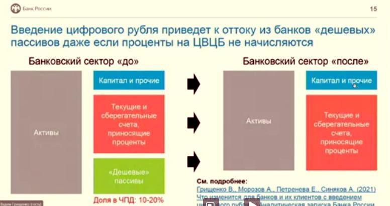 Поэтому ликвидность, под нею мы подразумеваем здесь объем средств банков в центральном банке, или банковские резервы, будет сокращаться в этом сценарии эмиссии цифрового рубля. Кроме того, банки, так как испытывают отток средств, в том числе отток средств по депозитам, естественно, будут стремится затормозить этот процесс, повышая ставки по депозитам прежде всего. И важным вопросом для анализа трансмиссионного механизма денежно-кредитной политики является следующий: а приведет ли это к сопоставимому повышению ставок по кредитам? То есть транслируется ли повышение ставок по депозитам в повышение ставок по кредитам «один к одному»? На мой взгляд, этого не произойдет, если коротко отвечать на этот вопрос.