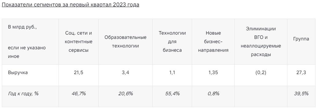 Выручка сегмента «Социальные сети и контентные сервисы» выросла на 46,7% (до 21,5 млрд руб.), сегмента «Образовательные технологии» – на 20,6% (до 3,4 млрд руб.), сегмента «Технологии для бизнеса» – на 55,4% (до 1,1 млрд руб.).