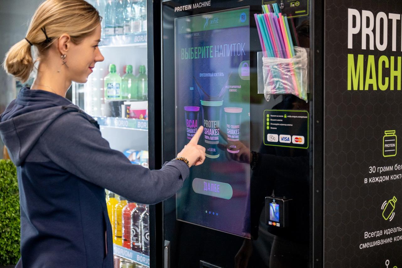 После беседы Владимир Галкин показал, как работает один из вендинговых автоматов со спортивным питанием, установленный в фитнес-клубе бизнес-центра «Футурис». Кроме обычной оплаты карточкой, терминал считывает и фитнес-браслеты клуба.