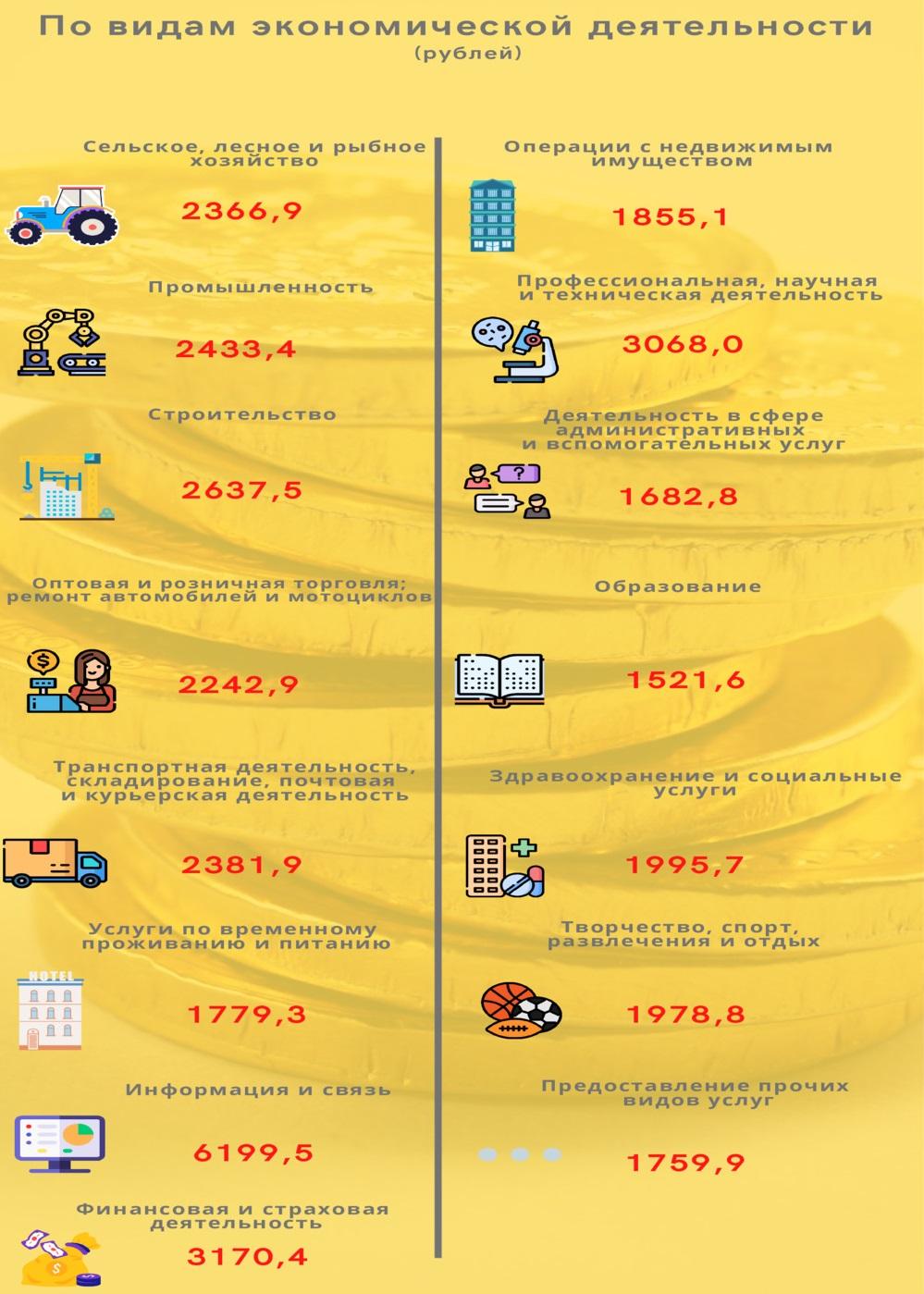 Согласно данным официальной статистики, в сентябре лидирующие позиции в рейтинге столичных зарплат по видам экономической деятельности занимали информация и связь (6199,5 руб.), финансовая и страховая деятельность (3170,4 руб.), профессиональная, научная и техническая деятельность (3068,0 руб.).